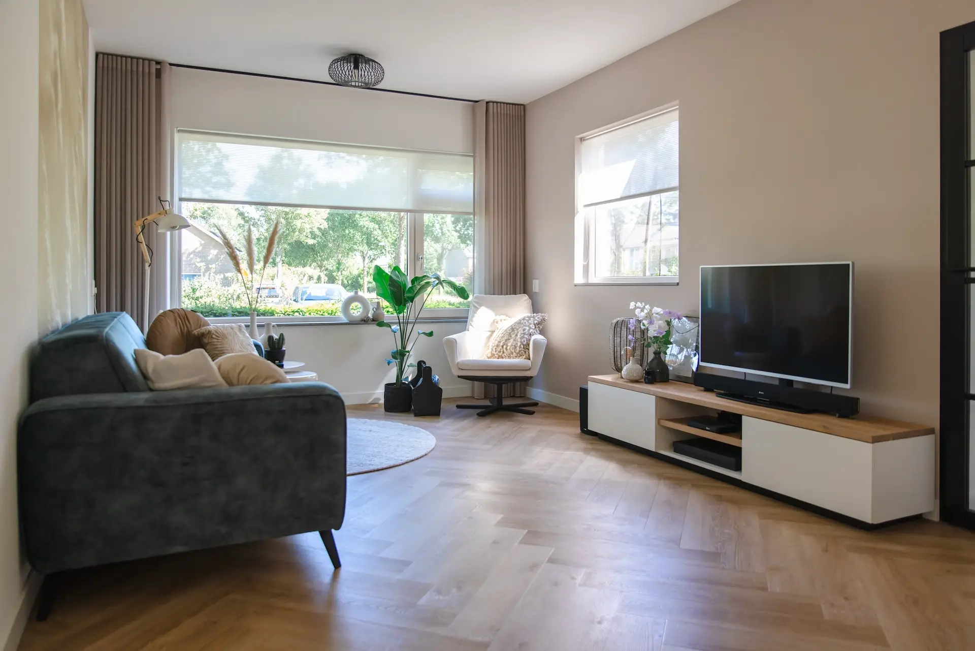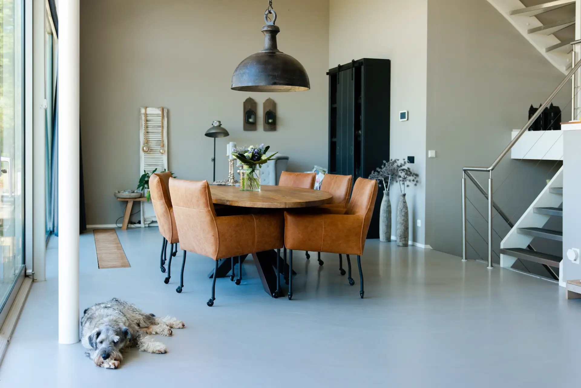 De showroom van de Wenloads gaf dusdanig veel inspiratie om toch de hele woonkamer maar aan te pakken. Tijdens het oriënteren op een bank vielen de ogen op een eethoek in de showroom. De oude eetkamerstoelen zaten niet meer lekker, dus besloten ze de eethoek ook te vernieuwen. De eettafel stond bij deze stoelen in de showroom en dat was een perfecte match. Met de prachtige lamp boven de tafel is de volledige eethoek opeens een compleet interieur plaatje geworden.