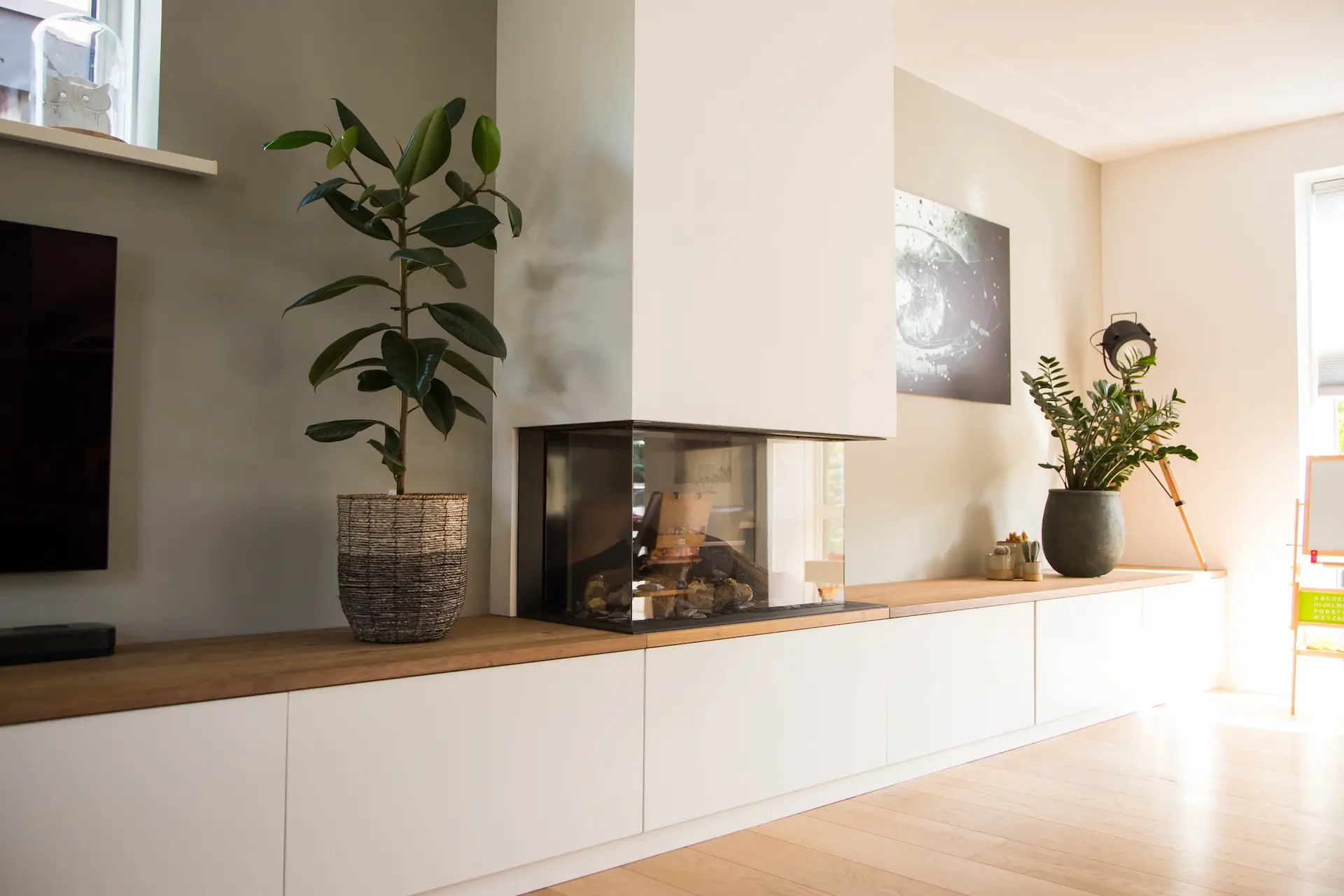 “We hadden een groot meubel nodig, want verder hebben we weinig muren waar we opbergruimte kunnen creëren. Toen de kast af was zeiden ze bij Wenloads ook al: ‘wat een ding joh!’. Maar het is prachtig geworden en hij valt mooi om de open haard heen. Alsof de kast één is met de open haard.”